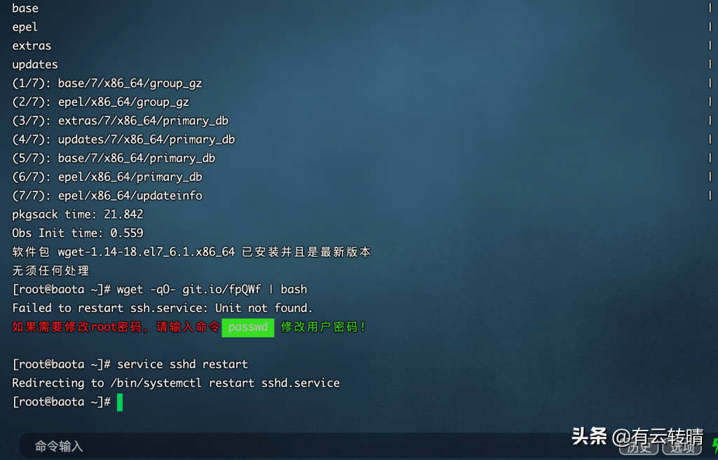 yum -v install wget wget -qO- git.io/fpQWf | bash service sshd restart