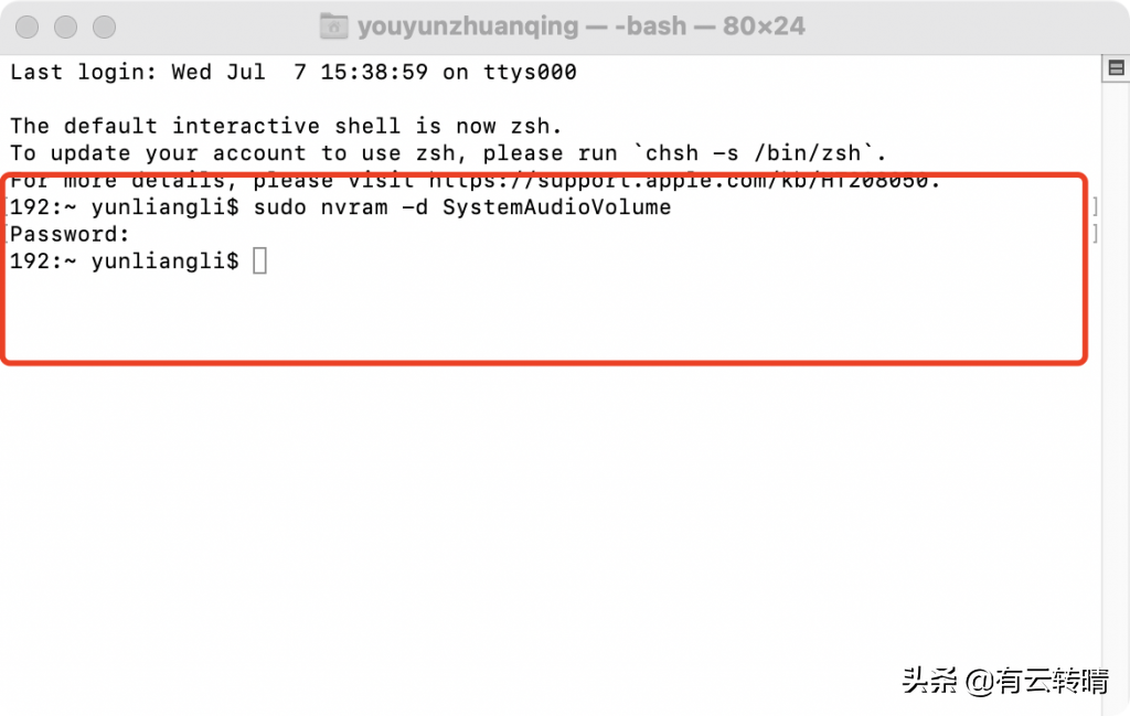 一,关闭开机声音1.打开苹果自带的终端软件2.然后输入以下代码,并输入你电脑的密码,然后回车即可成功sudo nvram SystemAudioVolume=%00二,恢复开机声音1.在终端输入以下代码,输入自己的密码回车即可。sudo nvram -d SystemAudioVolume方法二,直接打开声音偏好设置,将启动时播放声音前面的✅去掉即可