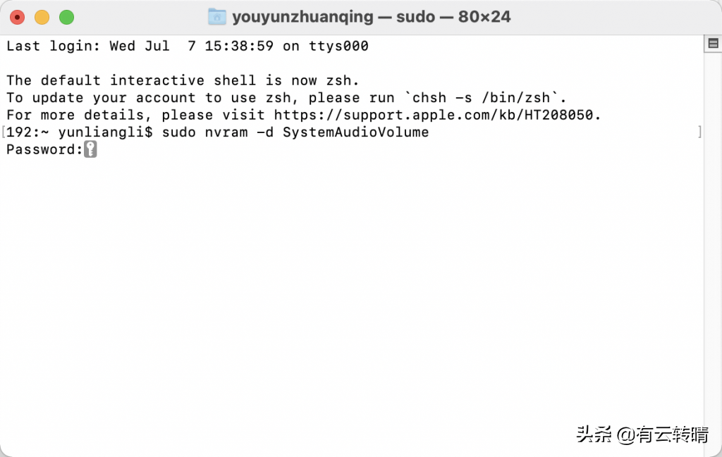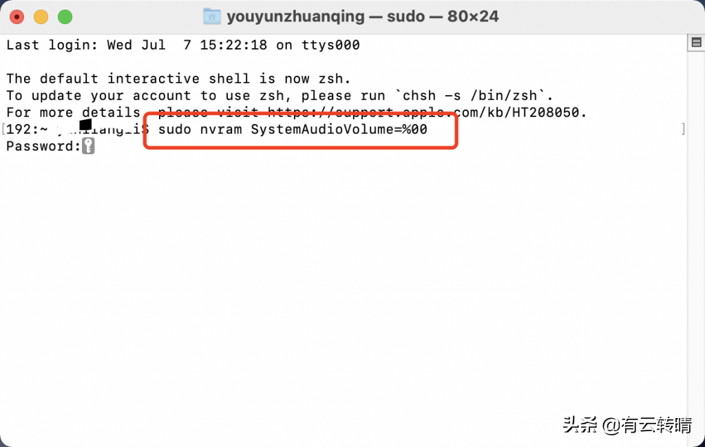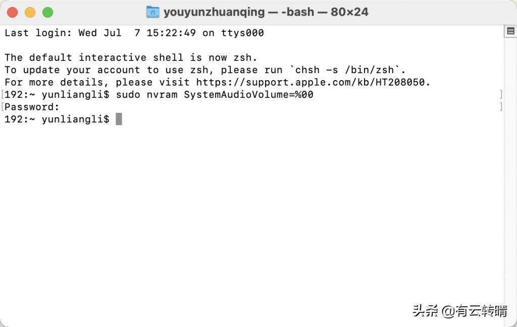 一,关闭开机声音1.打开苹果自带的终端软件2.然后输入以下代码,并输入你电脑的密码,然后回车即可成功sudo nvram SystemAudioVolume=%00二,恢复开机声音1.在终端输入以下代码,输入自己的密码回车即可。sudo nvram -d SystemAudioVolume方法二,直接打开声音偏好设置,将启动时播放声音前面的✅去掉即可
